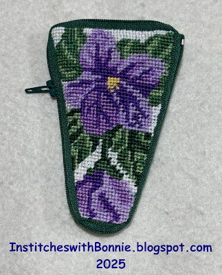 The design is stitched with floss rather than tapestry wool. I'm happy to have this one finished. I knew the needlepoint canvas would be rough on my scissors so I lined it with some velvet like fabric. We took another cruise on the same line with stitching sessions on sea days so I got a new project. It's suppose to be a glasses case but I've dismantled it so I can use it on a tote bag I'll make for it when it's finished. And here's the inside of the scissors case.